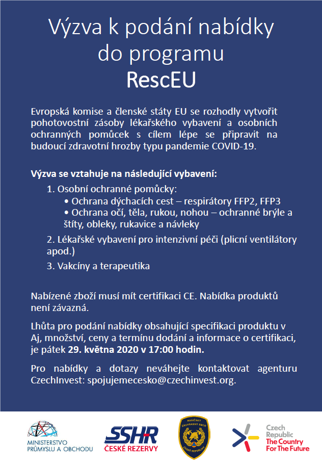 Evropská komise a členské státy EU se rozhodly vytvořit pohotovostní zásoby lékařského vybavení a osobních ochranných pomůcek s cílem lépe se připravit na budoucí zdravotní hrozby typu pandemie COVID-19. Výzva k podání nabídky do programu RescEU Publikováno dne 21. 5. 2020